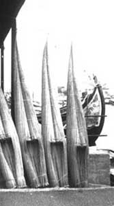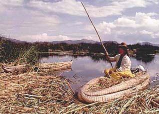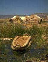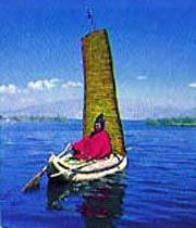 The totora (reed) around Lake Titikaka is gathered while still fresh and formed into bundles tied with rope made from ichu (prairie grass), which are dried out for several weeks. The bundles are then bound into long tapering cigar-shaped cylinders to form the spine of the boat and pounded into a crescent shape. More bundles are added longitudinally to give the boat body and transversely to trap air and increase buoyancy. A light folding mast carries the square sail and a long oar steers the craft. The prow is traditionally topped with an animal's head fashioned from reeds. |