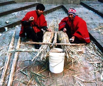 Erik and Maximo Catari constructing a reed ("balsa") boat at the