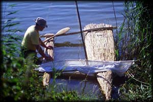 During the Fall of 1995, Aymara boatbuilders Erik and Maximo Catari came to the University Museum to demonstrate the construction of a "balsa" reed boat (a 2/3 scale model). The father-son team spent 3 days constructing the reed boat which was tested in the Museum reflecting pool after their public lecture on traditional boatbuilding. They build these boats for sale in their home town of Huatajata, located on the shores of Lake Titicaca, Bolivia.