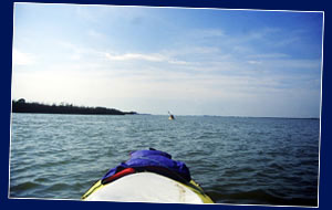 Pendant le chargement du matos, un gros bateau qui passait par là fit naître une vague qui secoua quelque peu Tom qui était allongé pour ranger un sac à l'avant ... Ce remous en profita aussi pour inonder le kayak de Yann et humidifier l'appareil photo qui n'avait pas été remis dans le sac plastique attitré ...